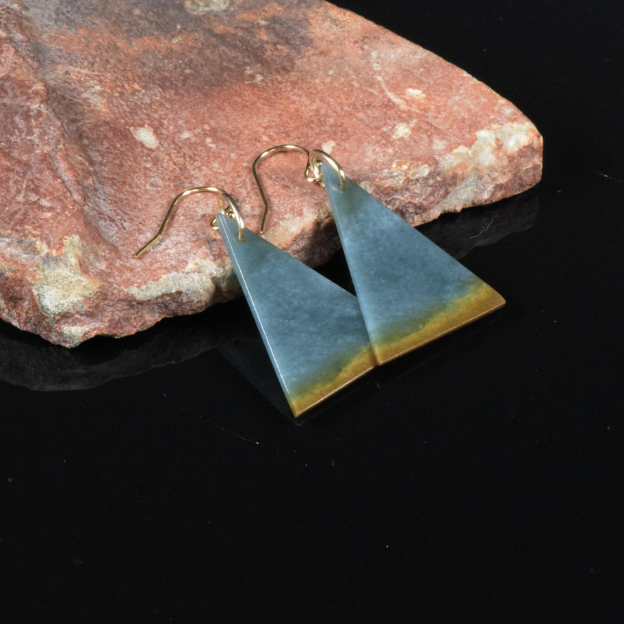 These earrings are a very nice deep blue/green with a nice bottom egde of orange influence. They are uniform in thickness and considered my standard flat surface earrings. All edges have been rounded and polished. The flat surface is highly polished and very reflective which is hard to do with jadeite flat surfaces. I spend a lot of time on the detail of all my items which makes these a very nice high quality pair of earrings.