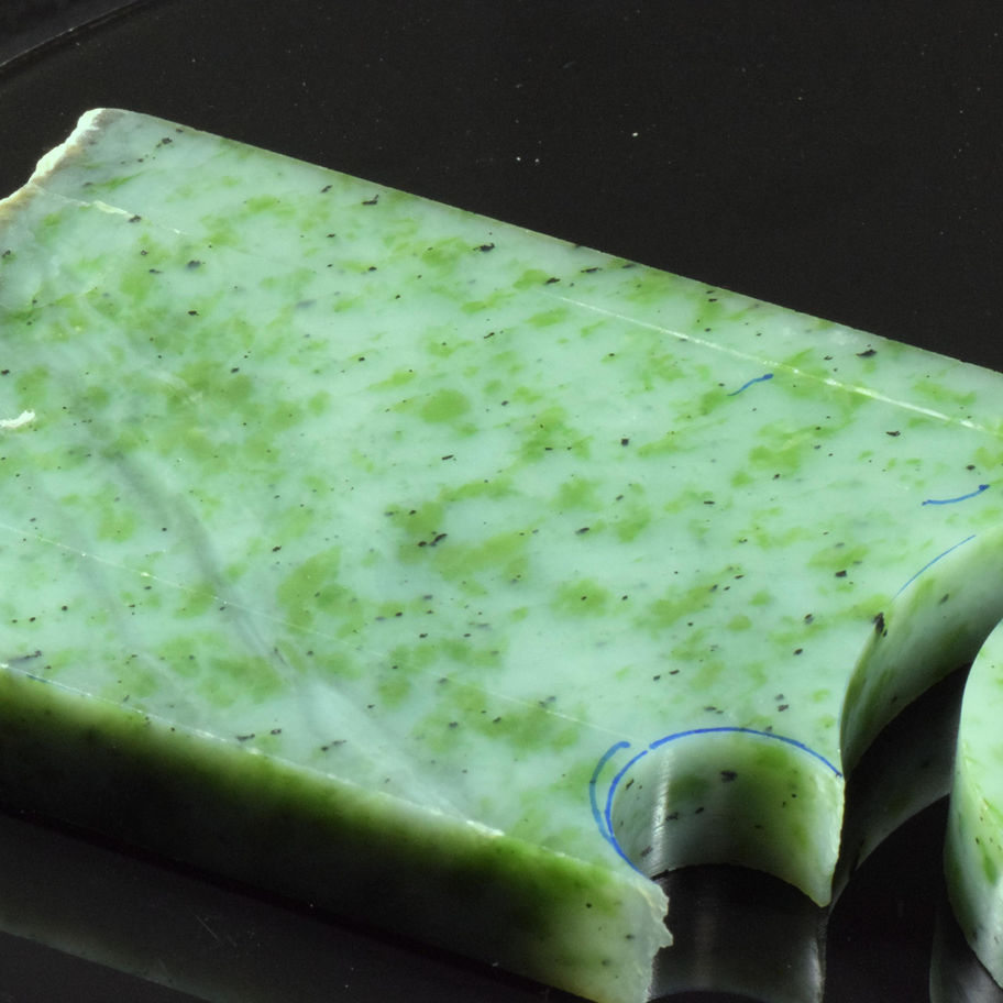 There is very little information I can find on this material. Must be very rare. It appears to be very hard and takes a high polish. Light green with a touch of blue hue. Small black random spots.