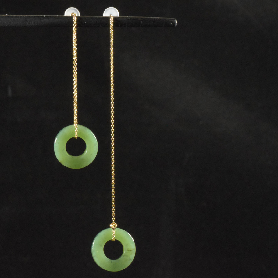 A rare oppertunity to own some Wyoming "Apple" nephrite jade earrings. Typically, this highly sought after jade is only aquired from small specialized carvers. There's not enough of this jade to find it in the common as it is never mass produced. These earrings are unique in that they are small donuts that can be worn in two different lengths or one each to very unique.