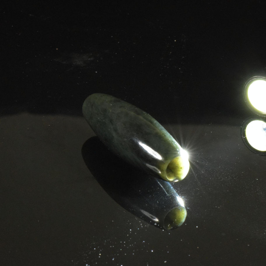 This is a long length bead made from Nephrite Jade Bead from Big Sur California. There are a few white streaks in this bead. This bead is shaped as a long barrel bead. The edge of the ends has thin edge and the holes are fully concave and polished. The material is a dark green with a slight brown tone with some black modeling. The polish is high but has a slight uneven texture to it.