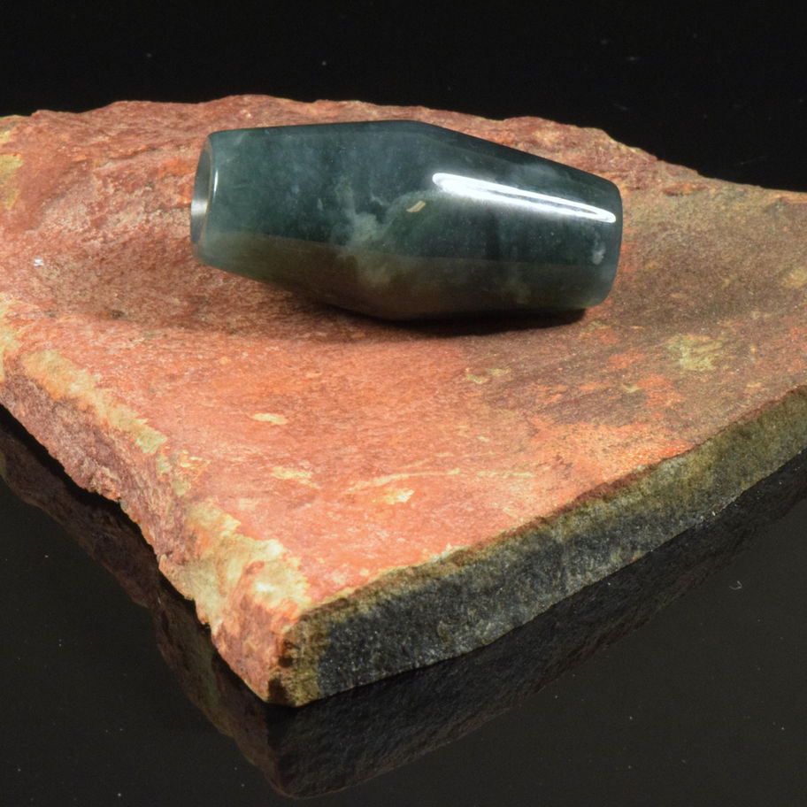This bead is a substantial thick barrel bead with high middle crest that is tapered to the ends from the middle. The ends have the Jadedivers original conical caved out appearance that are deep on this one . This is made from the Olmec Blue Jadeite from Guatemala. The material his a medium to dark blue with some light white snow patterns.  There are no hidden fractures and has one healed fracture that are common in this material. High polish all details covered when making this bead.