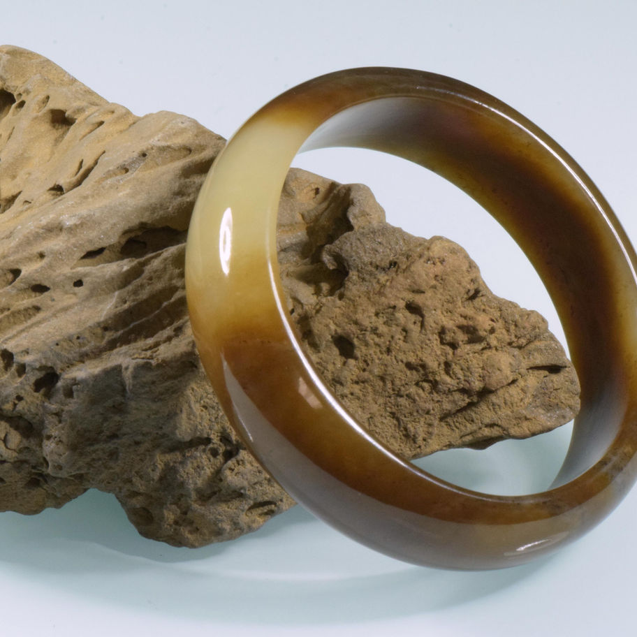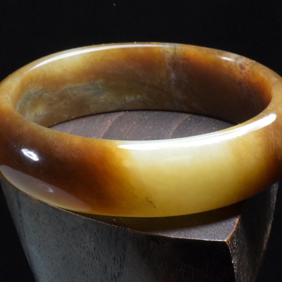 Exceptional Siberian dark honey colored bangle with a bit of white in it. This bangle is shaped as a fairly wide "D" shape but not quite a cuff size. There are some patterns in the darker areas of the material but hard to see. This is a beautiful bangle that has a rare and unique color. Excellent polish and shape on this one as well.
