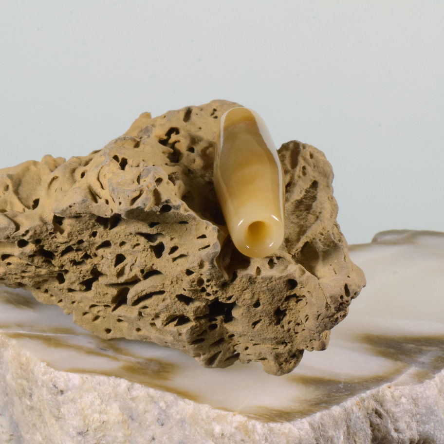 This Bead is shaped with a slight high middle crest that is not simply tapered to the ends from the middle but is slightly concave from the center to the ends. This is a mixed colored Bead with the lighter "honey" colors being most prevalent on the ends and a darker "honey" color in the middle. This was designed on purpose to be like this so the ends glow in bright light. Great looking bead and like other Siberian "Honey/Butterscotch" items, they always are a conversation pieces as the color is extremely rare and unusual.